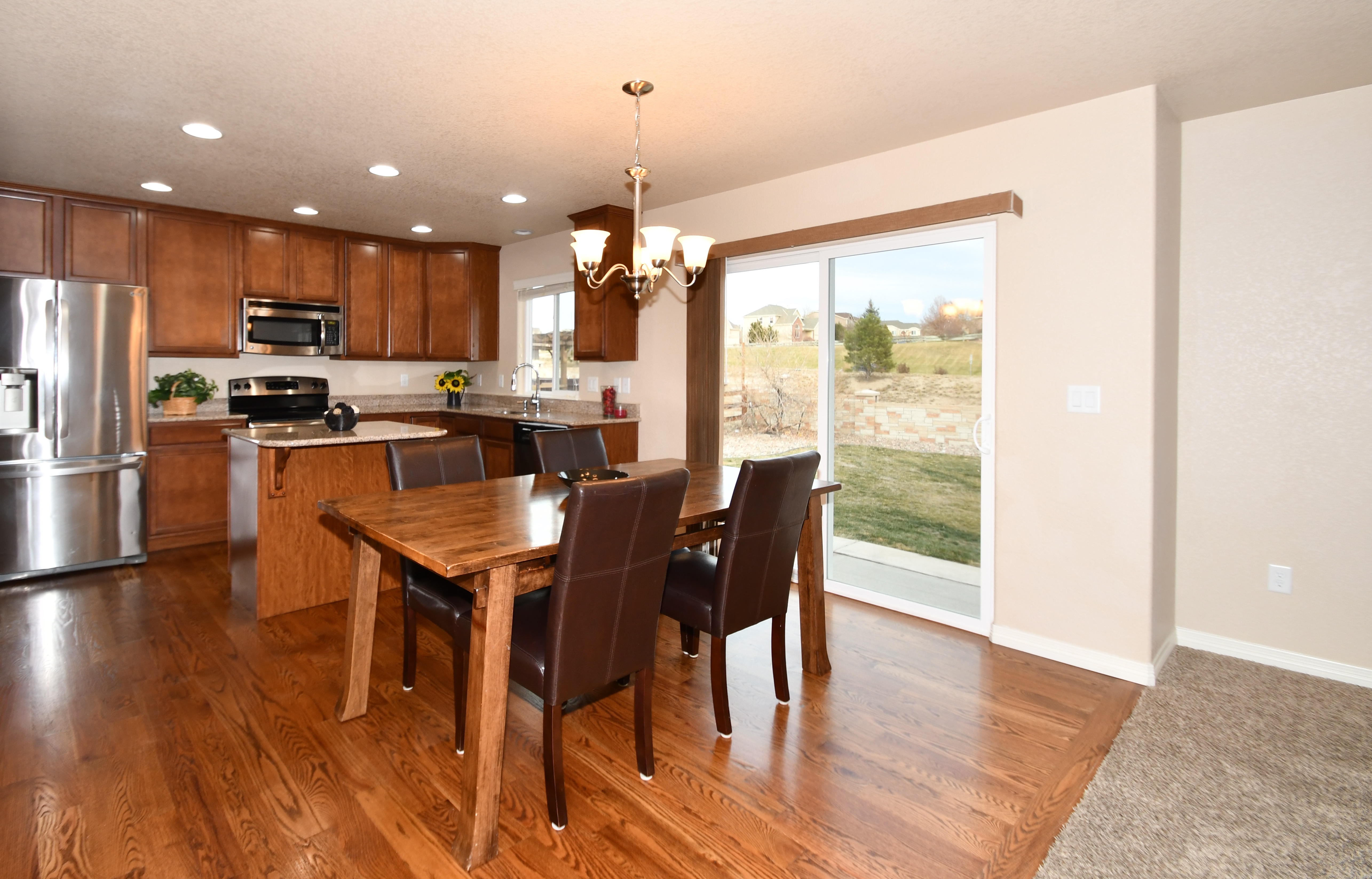 Superb 2-story with upgraded kitchen featuring slab granite countertops, upgraded maple cabinets, stainless steel appliances (including refrigerator), expanded pantry and beautiful hardwood floors. Dining Nook also has hardwood flooring and walkout to patio. The Living Room/Great Room is very spacious and features an upgraded ceiling fan. There is plenty of parking with the large 3-car garage.